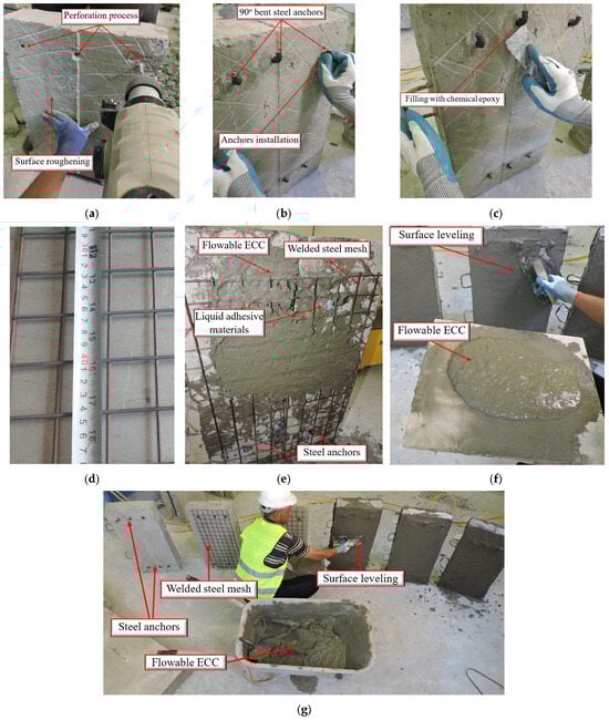 Strengthening of the samples: (a) surface adapting, (b) installation of steel anchors, (c) epoxy application for anchors, (d) the used welded steel mesh, (e) strengthening elements, (f) the used flowable ECC and (g) surface leveling.
