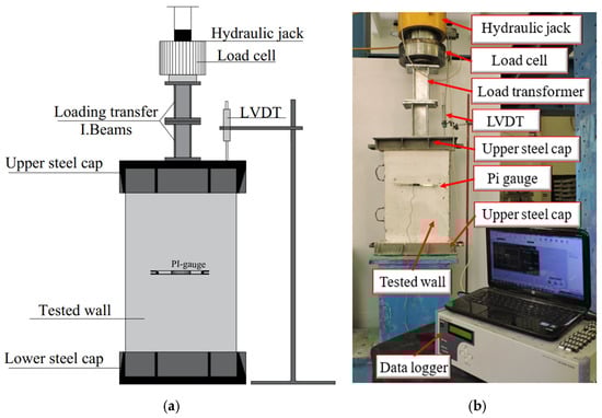 The experiment was conducted at Kafr El-Sheikh University, Egypt. Figure 5 illustrates the test setup of the samples. The specimens were painted in white paint for a better visualization. The hydraulic machine could exert forces up to 2500 kN on each tested wall. Rectangular caps were used to attach to both ends to facilitate a uniform load distribution as shown in Figure 5. A Linear Variable Displacement Transducer (LVDT) was used to record vertical measurements as shown in Figure 5. The walls were incrementally loaded to collapse during testing, with continuous monitoring of response. At each load stage, cracks were observed for reference, and vertical displacement readings were logged electronically.