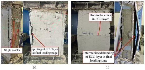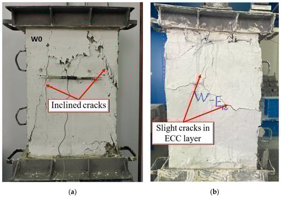 For the master group, including walls W0 and WD0-E10, the crack pattern is shown in Figure 6. W0 without an ECC layer shows the inclined splitting cracks indicating the diagonal tension occurred at the failure as shown in Figure 7a. These cracks extend through the wall’s body, suggesting that this wall undergoes significant cracking with the minimum reinforcement ratio. W0 failed suddenly with splitting cracks followed by concrete crushing at an ultimate load (Pu) of 683 kN. The other wall strengthened with a non-reinforced ECC layer with a 10 mm thickness (i.e., WD0-E10) presented a crack pattern and failure mode shown in Figure 6b. The crack pattern can be described as slight hair cracks observed in the ECC layer. The cracks are localized, and no wider cracks seem to propagate extensively. This was expected to be due to the superior strain-hardening in addition to the tightened crack ECC could significantly impress. The wall WD0-E10 could not absorb any given load beyond an ultimate load of 721 kN.