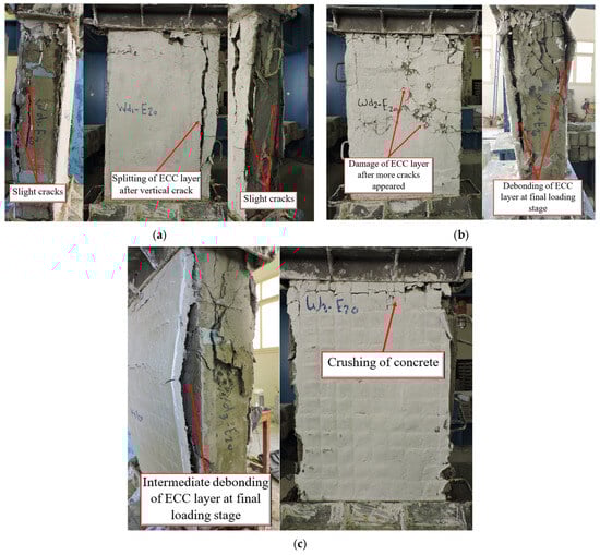 The third group G3 studied the impact of ECC layer thickness with different WSM numbers which delivered as a key parameter herein this group. Crack patterns and failure modes can be seen in Figure 8a–c for walls WD1-E20, WD2-E20 and WD3-E20 with one, two and three WSM, respectively. Wall WD1-E20 with 20 mm ECC layer reinforced with one WSM showed splitting of the ECC layer after the appearance of vertical cracks. Although the steel mesh provided additional augment, the cracks led to partial de-bonding of the ECC layer at the failure. The presence of WSM reduced crack propagation but did not eliminate it completely. This wall failed at an ultimate load of 832 kN due to a splitting crack followed by de-bonding of the strengthening thickness. Wall WD2-E20 with a 20 mm ECC layer reinforced with two WSM exhibited more significant damage to the ECC layer after the appearance of the initial hair cracks. These cracks were more distributed, but the presence of extra welded meshes allowed the wall to endure larger loads before the collapse. This may lead to the better contribution of increasing the number of WSM as an additional reinforcement of the overall performance. This wall resisted an ultimate load of Pu of about 887 kN due to damaging the ECC layer followed by NC crushing and de-bonding of the ECC layer. The last wall, WD3-E20, with a 20 mm ECC layer and three WSM displayed an intermediate de-bonding of the ECC layer associated with the crushing of concrete as failure mode as shown in Figure 9. The increased reinforcement prevented severe crack propagation initially, but de-bonding and material crushing occurred due to the limitations of the ECC–concrete bond under extreme loading. The wall of WD3-E20 achieved the largest ultimate load which was 964 kN failing due to intermediate de-bonding with NC crushing.