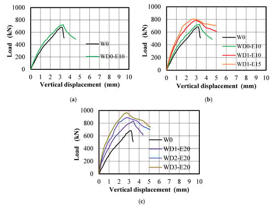Load–vertical displacement: (a) group G1, (b) group G2, and (c) group G3.