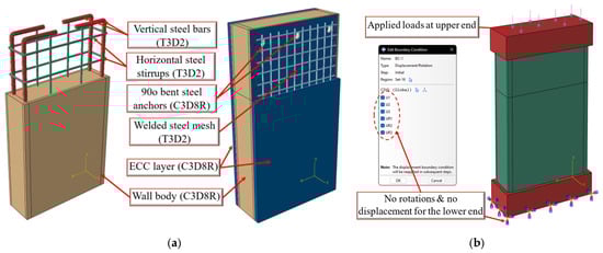 The ECC–NC interface surface was defined through two procedures. The first was surface-to-surface contact assumed to define the ECC–NC interface surface with a small differential friction coefficient of 0.3 employed in the tangential directions to display the de-bonding [47]. This mechanism was achieved by selecting the wall’s surface as the master surface, while the ECC strengthening surface was the slave rival. The second procedure was to employ the embedded anchors to bond the two surfaces. The constructed model rested on a thick steel plate with larger stiffness that acted as supporting plates on the upper and lower surfaces, simulating fixed boundary conditions at the bottom surface as shown in Figure 10b. Lastly, based on the sensitivity analysis, the size of the mesh was selected as 9 mm.