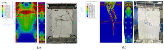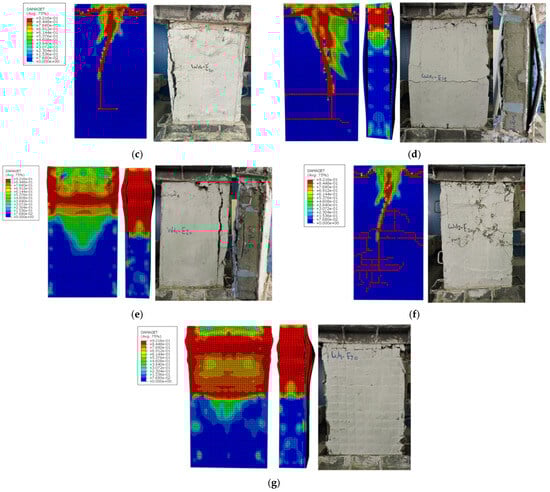 The average ratio between the FEM and test results was approximately 0.97 for the cracking stage and 0.98 for the ultimate stage, with corresponding coefficients of variation (CoV) of 0.001 and 0.001, respectively. Consistent with experimental observations, the numerical models successfully predicted sudden splitting cracks as the primary cause of wall failure, as demonstrated by models WD0-E10 and WD1-E10 (Figure 11b,c). Additionally, unexpected de-bonding of the ECC strengthening layer was observed in wall WD1-E-15, following the appearance of a sudden brittle crack with horizontal localization as shown with red color in Figure 11d. In a similar context, model WD2-E20 exhibited a pattern of closely spaced random cracks, reflecting the crack-tightening characteristics of ECC, as shown in Figure 11f. Moreover, the significance of a 20 mm thick ECC layer reinforced with three WSM was demonstrated in model WD3-E-20, as shown in Figure 11g. Excessive stresses were concentrated at the upper mid-height of the wall. This led to the deterioration of the ECC strengthening layer, indicating its capacity to bear higher loads.