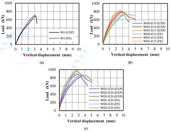 These findings suggest that the developed models accurately simulate the experimental failure modes of the tested walls under vertical static monotonic loading. Figure 12 provides a comparison of the load–displacement responses for all the tested walls, showing that the FEMs closely align with the experimental outcomes.