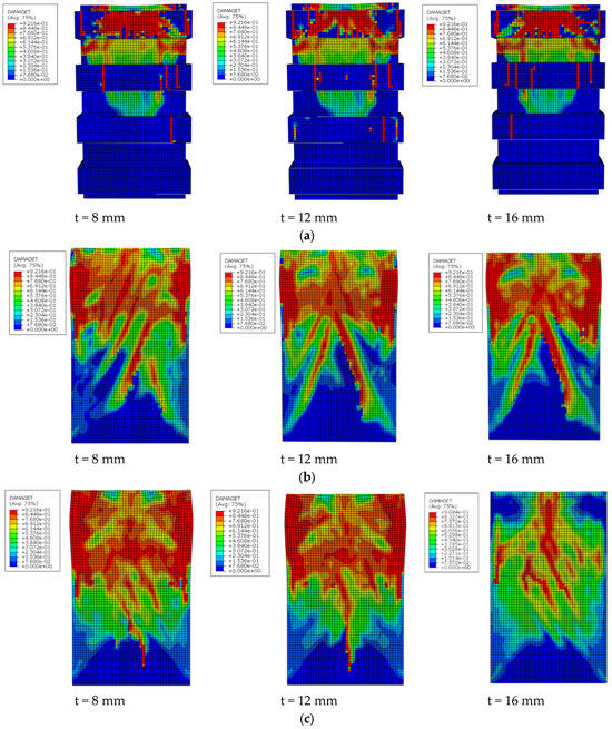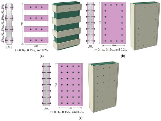 The validated FEM has been extended to better understand the reinforced NC wall strengthened with various configurations of ECC layers. It is noted that the configurations of anchor bolt incorporated here are different from those tested specimens. During the test, anchor bolts were selected based on constructability for the sample size to ensure adequate bonding between the ECC/UHPECC ferrocement layer and the concrete. However, in the parametric study, it aimed to evaluate the effect of the various configurations of ECC layers with various anchor distributions. Thus, the influence of anchorage parameters can be observed in a more generalized manner, allowing systematic variation in bolt number and distribution beyond the constraints of the experimental setup. The parametric study focuses on three techniques and three variables, including the strengthening configuration, number and configuration of anchors, and the ECC strengthening layer thickness with one WSM. The studied thickness varied between 8 mm, 12 mm, and 16 mm, giving strengthening thickness of (0.1 tw, 0.15 tw, and 0.2 tw, respectively). Figure 13 shows the schematic details of the parametric study for the three groups. The first group applied reinforced ECC jacket strips of the mentioned thicknesses, anchored to the NC wall as shown in Figure 13a. The second group applied a full ECC jacket with the same thicknesses, secured by anchors placed along the outer surface’s perimeter, including shorter sides (Figure 13b). The third group used a full ECC jacket along the outer surface’s perimeter, including shorter sides of the same thicknesses, bonded to the wall’s surface with evenly distributed anchors across the entire surface, as shown in Figure 13c. It should be noted that the ECC layer was applied on the shorter sides to provide continuous confinement and encircling of the wall cross-section.
