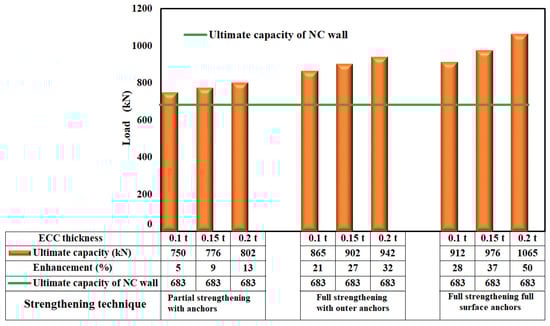 Figure 15 summarizes the effect of strengthening methods studied in parametric study on the ultimate capacity. As seen in Figure 15, the ultimate load capacity increased as the ECC layer thickness grew from strengthening cross-sectional area from 0.1 tw to 0.2 tw. The improvement ranged from 5% to 28% for a thickness of 0.1 tw and from 13% to 50% for a thickness of 0.1 tw. This indicated that thicker ECC layers not only bear more load but also show a greater improvement in performance. The partial strengthening technique produced only a modest improvement of about 5–13%, likely due to the incomplete coverage of the strengthened area. This may suggest that while strengthening localized areas with anchors can improve performance, it is not optimal for significantly increasing load-bearing capacity. The second technique improved the ultimate capacity of the NC wall by about 21–32%, showing a notable improvement in loading capacity. Anchors placed around the outer perimeter provided more uniform distribution, enhancing structural integrity compared to the previous method. The full-area-full-anchors distribution increased the ultimate capacity by up to 50%, making it the most effective strengthening method. In this context, the effect of anchors distributed across the entire surface contributed significantly to improving the wall’s load-bearing capacity transferring the applied load into the whole strengthening parts.