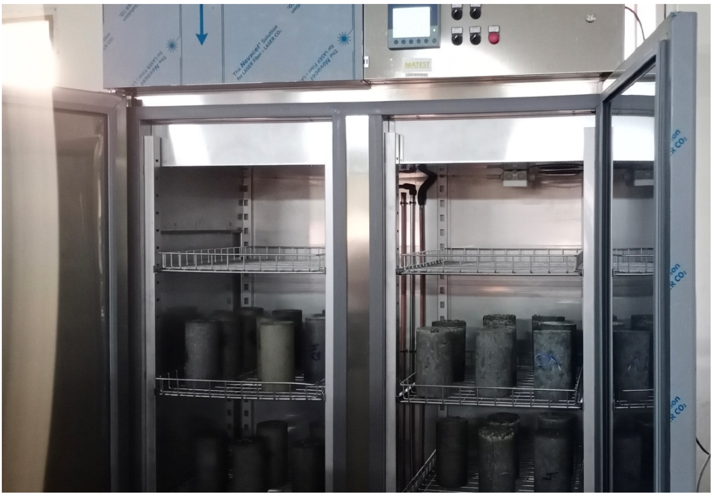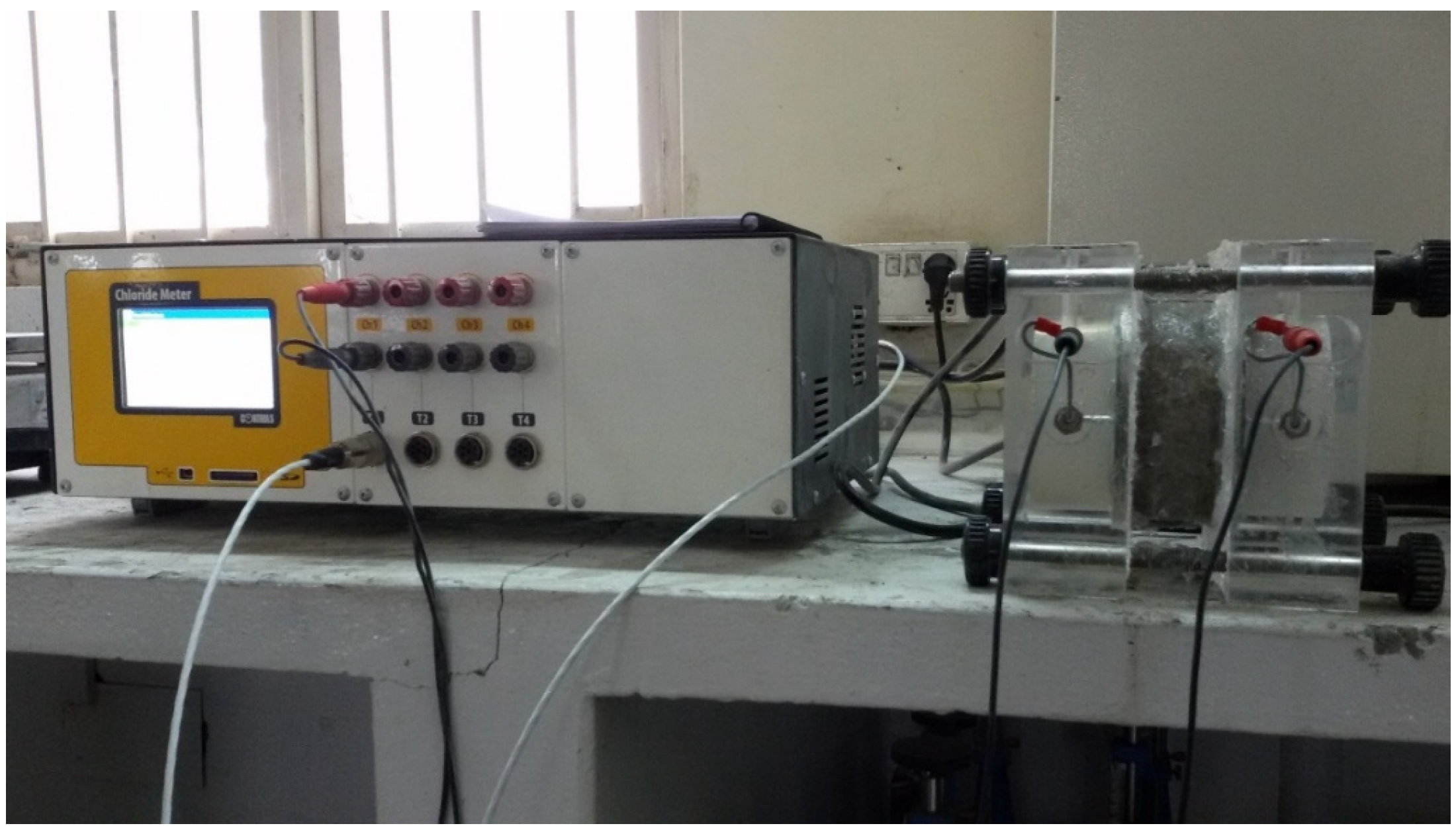 - ASTM C1202; Standard Test Method for Electrical Indication of Concrete’s Ability to Resist Chloride Ion Penetration. American Society for Testing and Materials: West Conshohocken, PA, USA, 2012; pp. 1–8. Available online: https://store.astm.org/c1202-12.html (accessed on 13 February 2026).