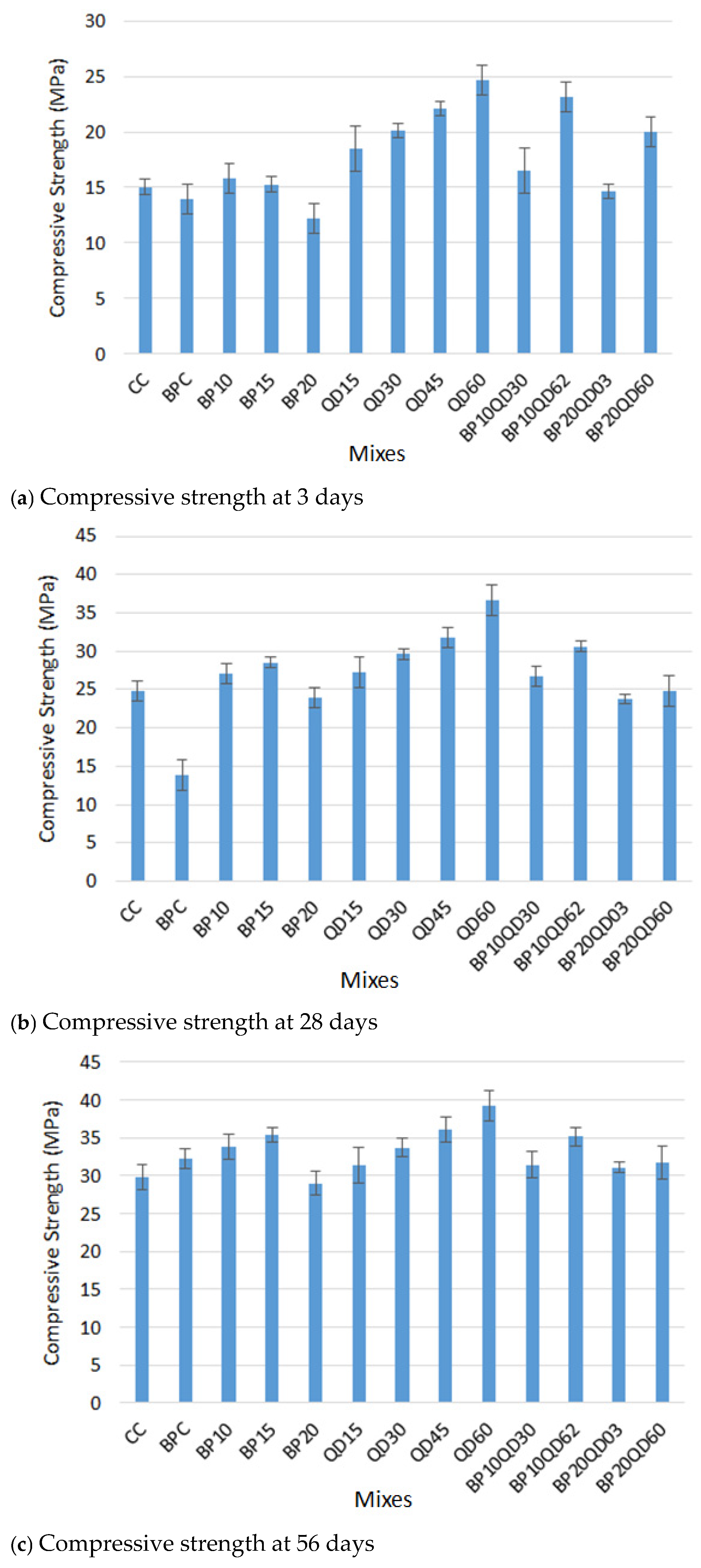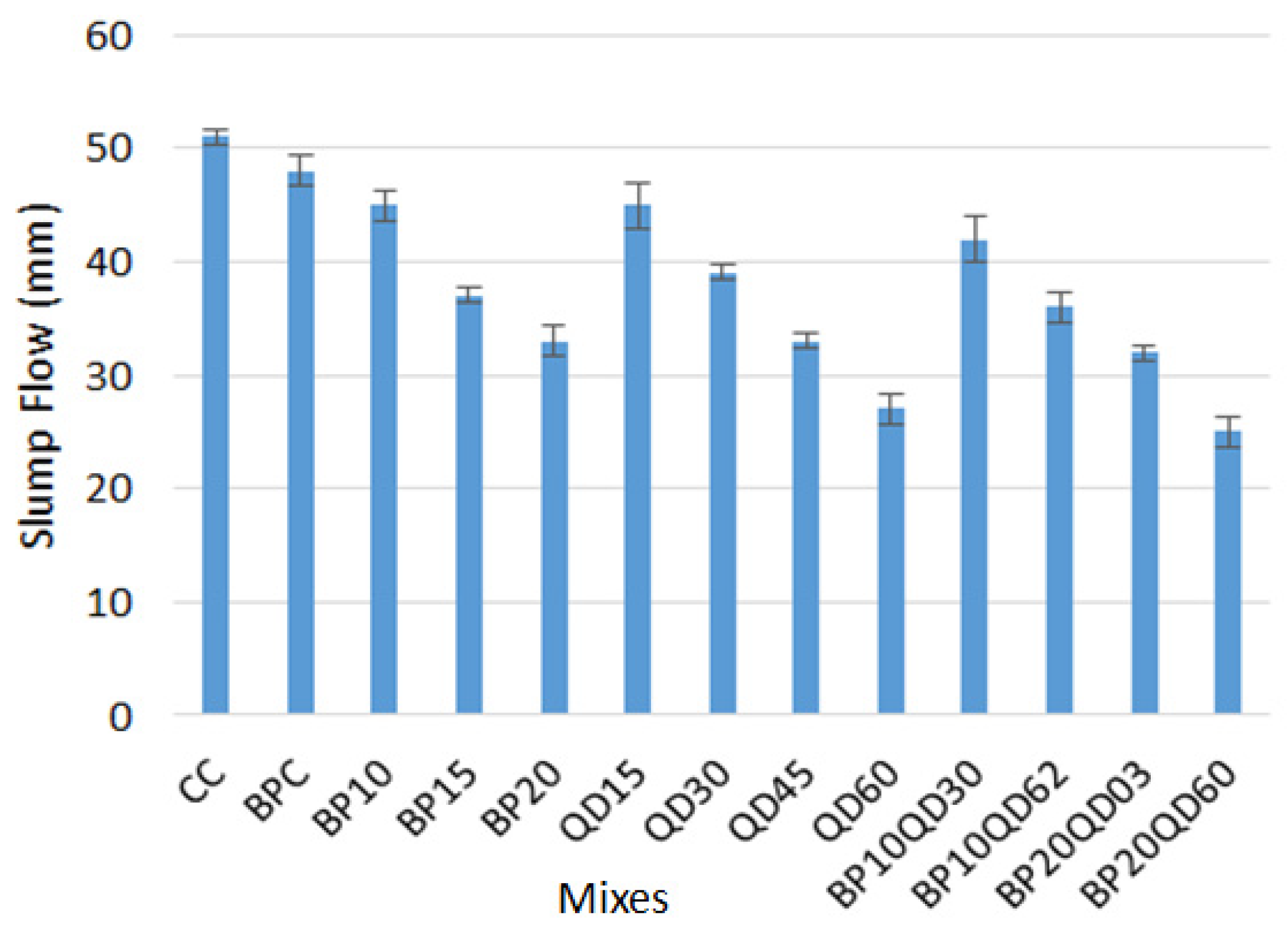 - Based on the outcomes of different properties (mechanical and durability), the optimum mix that had brick powder and quarry dust was BP10QD60, with 10% BP as cement replacement and 60% QD as a natural sand replacement, which showed significantly enhanced mechanical and durability properties. Also, it was found 11.2% cheaper than the CC mix;