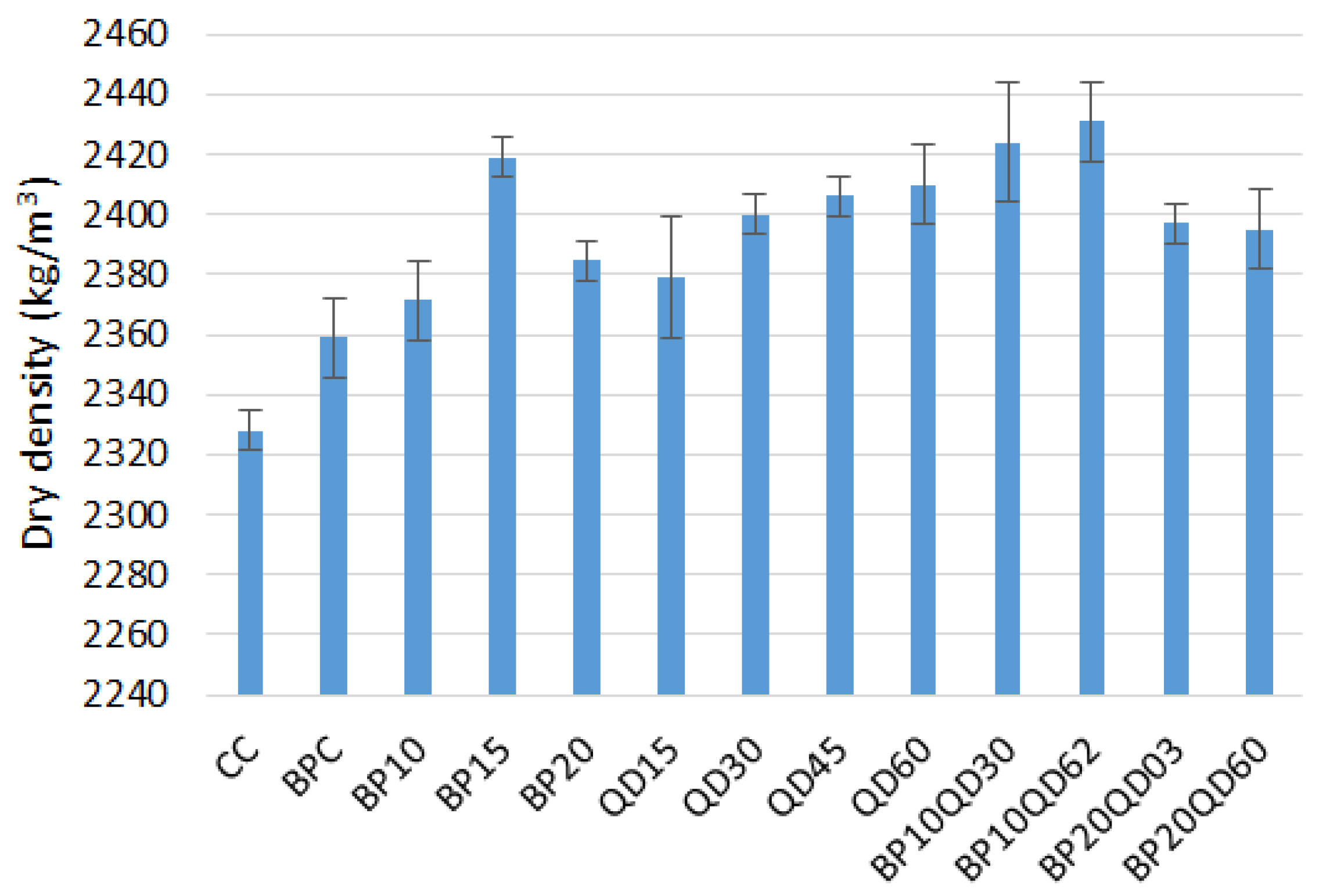 - The dry density of concrete improved with the addition of brick powder and quarry dust. Concrete density increased up to 15% substitution of BP with cement. All mixes with quarry dust replacements showed higher density as compared to CC. Combined mixes also exhibited higher densities as compared to CC;