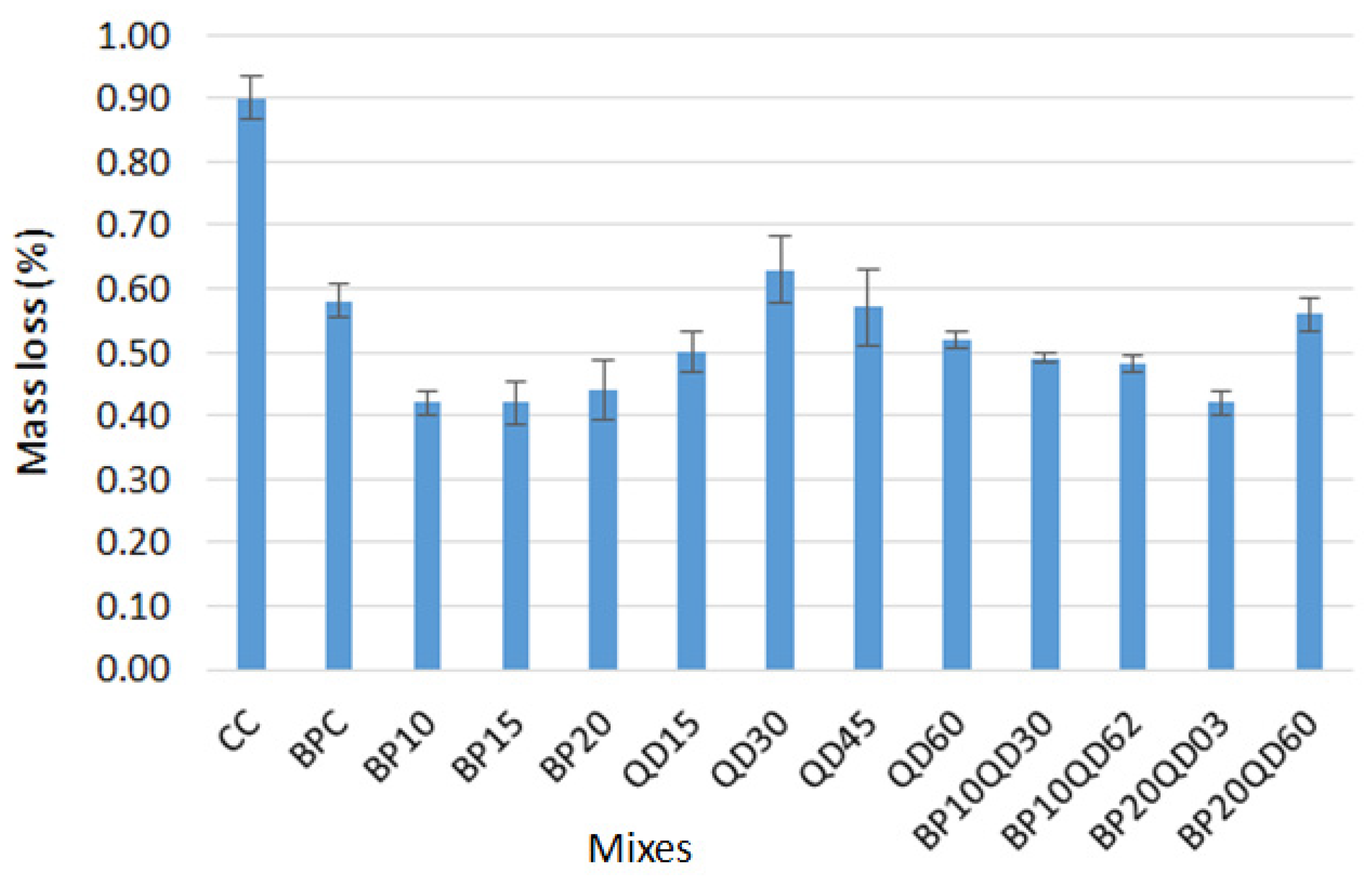 - Mixes with brick powder and quarry dust exhibited lower mass loss values as compared to the control mix when subjected to 28 freezing–thawing cycles; hence, better durability properties were achieved;