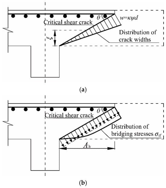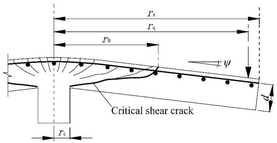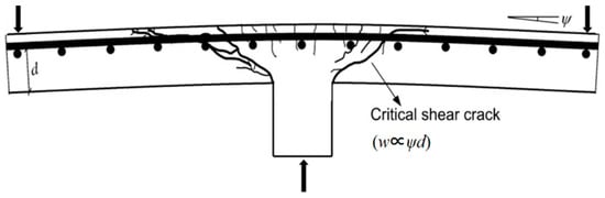When a reinforced concrete (RC) slab is subjected to a localized punching load, the shear force is transferred from the column to the inclined compression struts [20]. As the load increases, a critical shear crack forms and propagates, intersecting the compression struts, as presented in Figure 1. Based on the CSCT, the widening of this critical shear crack reduces the shear strength provided by the inclined concrete compressive struts and ultimately leads to punching shear failure. Thus, the punching shear strength decreases with the development of the critical shear crack as the slab rotates.