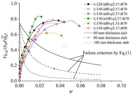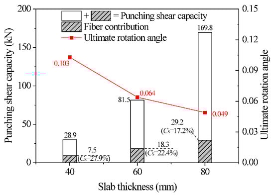 Figure 16 presents the influence of slab thickness on the punching shear capacity and ultimate rotation angle based on the calculation results (from Equation (25)) of slabs tested by Moreillon [8]. Compared to slabs with a 40 mm thickness, the punching shear capacities of slabs with 60 mm and 80 mm thickness increased by 182% and 487%, respectively, while the corresponding steel fiber contribution ratios decreased by 19.7% and 38.3%, respectively. As the slab thickness increased, the punching shear-span ratio decreased, and the critical failure perimeter increased, resulting in an improvement in the punching shear capacity. Furthermore, the flexural stiffness of the UHPC slabs improved with the increase in slab thickness, which restricted the development of the critical shear crack and reduced the fiber bridging effect [25]. Hence, the fiber contribution ratio decreased.