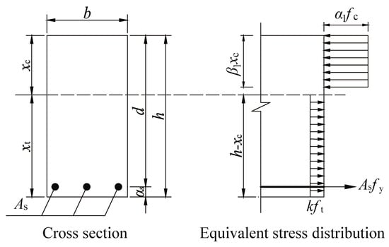 - A rectangular stress block distribution is assumed for both the compressive and tensile zones [28], as shown in Figure 5, where xc and xt are the depth of compressive zone and tensile zone, respectively; b is the section width; d is the effective depth; α1 is the ratio of average compressive stress to fc; β1 is the ratio of height of rectangular stress block to xc; fy is the yield strength of steel bar; ft is the axial tensile strength of UHPC; and k is the ratio of average tensile stress to ft, taken as 0.8 [28].