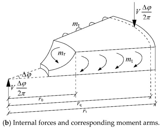 - A geometrical model of an equivalent circular UHPC slab was introduced [20], as shown in Figure 4, where rc is the column radius; r0 is the radius of the critical shear crack; rq is the radius of the circular support line; and rs is the radius of the slab. In the region within the radius r0, the intensive tangential cracks are assumed to form, and the radial curvature (χr) equals the tangential curvature (χt). Outside the radius r0, the radial curvature decreases quickly and can be ignored. Thus, the corresponding slab portion was assumed to be a cone with a constant rotation. The above simplifications can be expressed as Equation (2), where r denotes the radial distance from the column center.