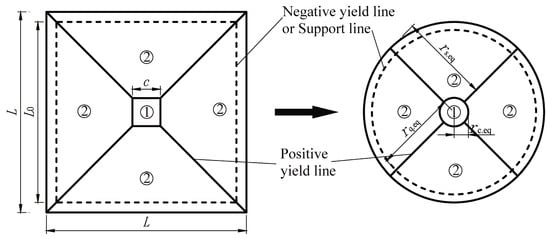 Equation (10) is suitable for predicting the load-rotation behavior of circular UHPC slabs with a circular loading area. For practical applications involving square slabs, an equivalent transformation to a circular configuration is therefore required. Referring to the crack patterns documented in Refs. [4,8,11,15], a general yield-line pattern is adopted for the UHPC slabs, as shown in Figure 9, where L is the side length of the square slab; rs.eq, rq.eq and rc.eq are the radii of the equivalent circular slab, the circular support line, and the loading area, respectively.