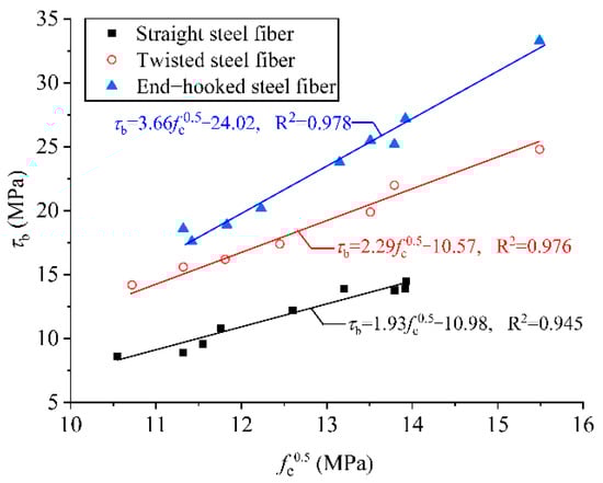 In the present study, the test results of twenty-five fiber pullout specimens were collected from references [30,31,32,33,34,35] to investigate the bond strengths of steel fibers in UHPC matrix, as shown in Figure 11. A significant linear positive correlation between bond strength and the square root of UHPC compressive strength was obtained. Compared with straight steel fibers, higher bond strengths were obtained for twisted fibers and end-hooked fibers in UHPC.