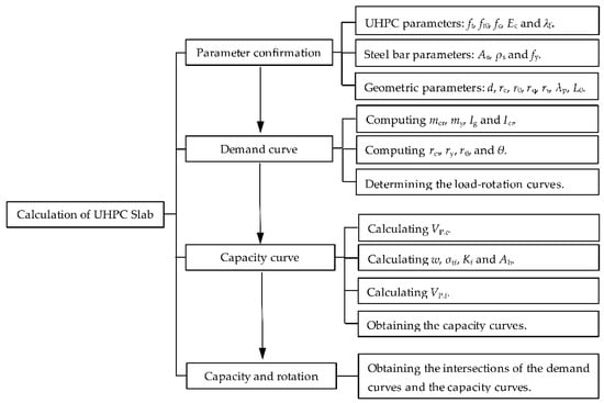 The calculation procedure for determining punching shear capacity of reinforced UHPC slab is depicted in Figure 13. It consists of the following four steps: First, the material and geometric parameters need to be predefined. For square slabs, Equation (15) is used to transform the geometry into an equivalent circular configuration. Next, the load-rotation curve is established. In this step, mcr, my, Ig and Icr are computed using Equations (4)–(6); rcr, ry, r0 and θ are computed using Equations (7) and (8). The demand curve is then determined by Equation (10). Subsequently, the failure criterion is formulated. Herein, VP.c is calculated via Equation (19); w, σtf, Kf, and Ah are computed using Equation (20), Equation (22), Equation (23), and Equation (26a), respectively; VP.f is calculated using Equation (25) or Equation (27). The capacity curve is subsequently determined by Equation (16). Finally, the punching shear strength and the corresponding critical rotational angle of the reinforced UHPC slabs are obtained by determining the intersection point of the demand curve and the capacity curve.