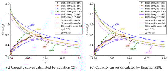 For ease of application, a term (1 + βvλf) was introduced to comprehensively regard the contribution of steel fibers on the punching shear strength of UHPC slabs [15], where βv is the enhancement coefficient of steel fibers. This approach significantly reduces the computational effort compared to using Equation (25) or Equation (27). Introducing (1 + βvλf) to Equation (19), a simplified equation for obtaining the capacity curve is given, as shown in Equation (28).