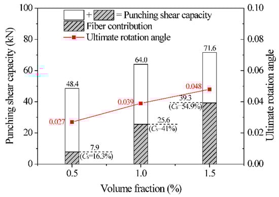 The influence of fiber volume fraction on the punching shear capacity and ultimate rotation angle was investigated based on the predicted results of UHPC slabs tested by Park [11], as depicted in Figure 17. Compared to the slab with a steel fiber volume content of 0.5%, the punching shear capacities of slabs with volume fractions of 1.0% and 1.5% increased by 51.9% and 71.4%, respectively, which results from the enhanced bridging effect of steel fibers. Moreover, a higher fiber volume fraction leads to an increase in the fiber contribution ratio and enhances slab ductility, which consequently improves the ultimate rotation angle.