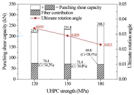 The influence of UHPC compressive strength on the punching shear capacity and ultimate rotation angle was analyzed based on the results of UHPC slabs tested by Fang et al. [15], as shown in Figure 18. Compared to slabs with a UHPC compressive strength of 120 MPa, the punching shear capacities of slabs with a UHPC of 150 MPa and 180 MPa improved by 6.5% and 14.1%, respectively. This improvement is attributed to the increase in tensile strength of UHPC and the shear resistance in the shear-compression zone. Furthermore, the elastic modulus increases with UHPC compressive strength, leading to an improvement in the flexural stiffness of the UHPC slab. Consequently, the development of the critical shear crack was restricted, and the fiber bridging effect decreased. Therefore, the fiber contribution ratio decreased with the increase in UHPC compressive strength.