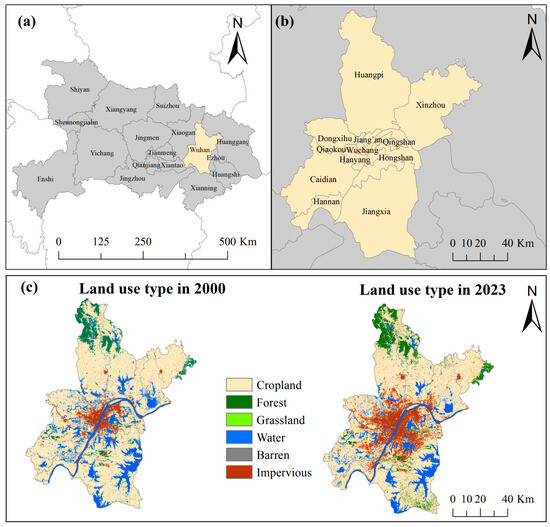 Study area and spatial context of Wuhan, China. (a) Location of Wuhan within Hubei Province and surrounding regions. (b) Administrative districts of Wuhan. (c) Land-use/land-cover patterns in Wuhan in 2000 and 2023.