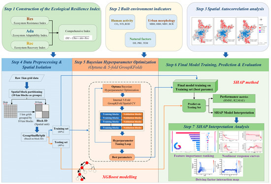 As shown in Figure 2, this study followed a seven-step workflow to investigate the nonlinear associations between the built environment and urban ecological resilience at a 1 km grid scale. Step 1 constructed the Ecological Resilience Index (ERI) by integrating ecosystem resistance (Res), adaptability (Ada), and recovery capacity (Rec). Step 2 compiled built environment indicators encompassing human activity and urban morphology, as well as natural factors. Step 3 assessed spatial autocorrelation to quantify the spatial dependence in ERI. Step 4 performed variable preprocessing and implemented block-based spatial cross-validation strategies; specifically, 1 km grids were grouped into 10 km blocks with unique IDs, enabling spatially stratified splitting (GroupShuffleSplit) into training and test sets. Step 5 conducted Bayesian hyperparameter optimization for the XGBoost model using the Optuna (v4.4.0) framework, employing internal 5-fold GroupKFold spatial cross-validation within the training blocks. Step 6 trained the final model using the optimal hyperparameters, generated predictions for the testing set, and reported performance metrics (RMSE, R2, and MAE). Finally, Step 7 applied SHAP to interpret the model outputs, including feature importance, nonlinear response curves, and pairwise interaction patterns.