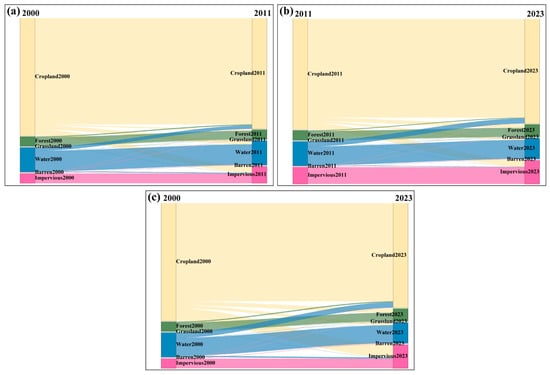 Land-use transitions in Wuhan. (a) 2000–2011. (b) 2011–2023. (c) 2000–2023.