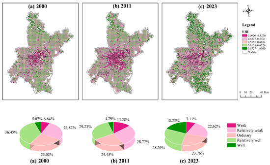 Spatial-temporal change in ERI. (a) 2000. (b) 2011. (c) 2023.