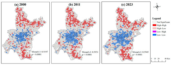 LISA maps and Global Moran’s I values of ERI. (a) 2000. (b) 2011. (c) 2023.