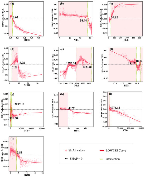 Existing studies generally acknowledge that ecosystem responses to external disturbances are nonlinear [11,13,18]. Some studies have explored threshold-like patterns using parametric nonlinear specifications. For example, Chen et al. employed a restricted cubic spline (RCS) model to characterize threshold relationships among physical geographic factors, anthropogenic drivers, and ecological resilience; however, RCS is limited in its ability to represent interactions among predictors [11]. More recently, machine-learning frameworks have been increasingly adopted to capture complex nonlinearities [23,24]. Using an XGBoost–SHAP approach, Wu et al. examined the nonlinear threshold patterns in the relationship between environmental regulation and ecological resilience [25]. Nevertheless, studies investigating nonlinear relationships between the urban built environment and ecological resilience remain limited.