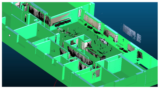 The initial step in this alignment process involved merging several segmented point clouds obtained from HoloLens image segments into a single cohesive 3D point cloud. This comprehensive point cloud was imported into CloudCompare software, (version v2.12 alpha), which was used to perform a two-step registration process. The first step involved a coarse alignment using point-pair registration, allowing rough alignment based on manually selected reference features. The second step involved fine-tuning through ICP registration, which minimized the Euclidean distance between corresponding point features in the merged HoloLens point cloud and the BIM-derived point cloud (Figure 5). The final registration achieved an error with an RMSE of 0.024. The transformation matrix, denoted as THC, which accurately mapped HoloLens spatial data into the BIM coordinate system: