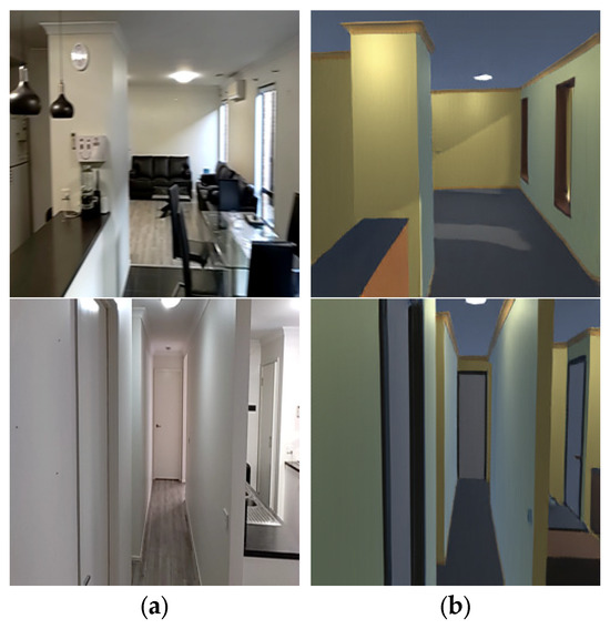 In order to reduce domain discrepancies between real and synthetic images, a CycleGAN model was trained for unpaired image-to-image translation [44]. The dataset comprised BIM-rendered images and HoloLens images with no one-to-one pairing; these were split in a 9:1:1 ratio into training, validation, and test subsets. Following the original architecture, we used generators based on nine residual-block architectures and discriminators employing the PatchGAN paradigm. Instance normalization was applied consistently across both generators and discriminators to stabilize style transfer and preserve structure. The model’s training objective balanced three loss components: adversarial loss to encourage realism in translated images, cycle-consistency loss to enforce that mapping there and back returns the original image, and identity loss to prevent unnecessary style shifts when input already lies in the target domain. During training, various checkpoints were evaluated using the validation set to assess the trade-off between visual realism and structural fidelity. Ultimately, the model at epoch 200 produced the best style-transferred results, renderings that most closely matched real-world textures while maintaining the geometric integrity of BIM structures (Figure 6a,b). As a note, the trained model was observed to suppress non-BIM semantic content, such as furniture and pendant lights, since these elements do not appear in the BIM domain, resulting in style-transferred images where structural geometry is preserved while nonstructural objects are visually de-emphasized.
