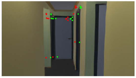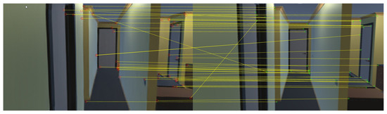 The rescaled CycleGAN-transformed images and their corresponding BIM images underwent feature matching using the KAZE [54] algorithm implemented in MATLAB using “detectKAZEFeatures” function. The images were first converted to grayscale, and keypoints were extracted using KAZE, known for its robustness to non-linear illumination and scale changes. The descriptors were matched between image pairs, and the matched keypoints were visualized and color-coded for interpretability (Figure 8).