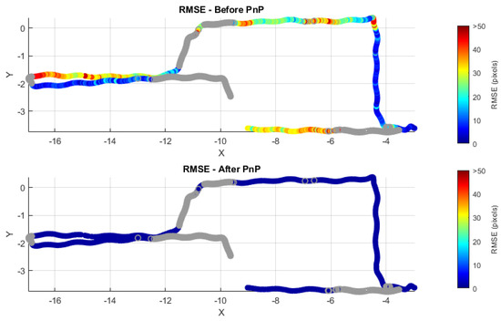 To reduce the influence of unreliable correspondences, only feature matches that satisfy geometric constraints during the PnP estimation are retained, and image pairs with insufficient or unstable matches are excluded from the evaluation. Accordingly, the reported RMSE reflects the degree to which the refined camera pose is internally consistent with the BIM geometry and image observations. A reduction in RMSE after pose refinement, therefore, indicates effective suppression of accumulated drift relative to the BIM reference, rather than absolute positional accuracy with respect to an external ground-truth coordinate system.