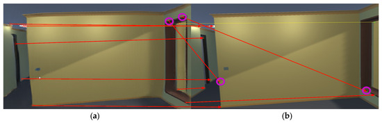 Following domain adaptation, feature correspondences were extracted between the CycleGAN-translated images and their corresponding BIM images using the KAZE feature detector. KAZE was selected after preliminary empirical trials indicated that it performs robustly under the nonlinear intensity variations introduced by the style-transfer process. Its nonlinear scale-space construction makes it more resilient to intensity distortions compared to traditional methods [53,54]. While alternative descriptors such as SIFT, ORB, and SURF could also be applied, the objective of this work was to establish a feasible and effective pipeline for drift refinement rather than to conduct a comprehensive comparison of feature extraction algorithms. We acknowledge that KAZE, like all keypoint-based approaches, remains limited in environments with uniformly textured or symmetric surfaces, and this inherent constraint contributed to the set of image pairs for which correspondences could not be reliably established.