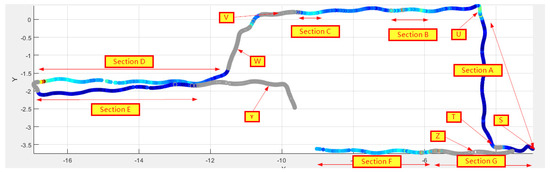 A significant challenge was encountered in a narrow corridor denoted by “B” in Figure 4. This section involved two abrupt turns over a short distance, which posed difficulties for the HoloLens in maintaining accurate pose estimation. Consequently, 46 images from this section were deemed unreliable due to incorrect or missing pose data. Despite multiple attempts to re-capture data in this specific corridor, the localization failures persisted, and the associated frames were ultimately excluded from the final dataset.