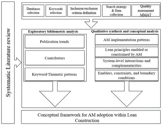 Research design illustrating the systematic review process, combining exploratory bibliometric analysis with qualitative synthesis to develop a conceptual interpretation of the relationship between AM and LC.