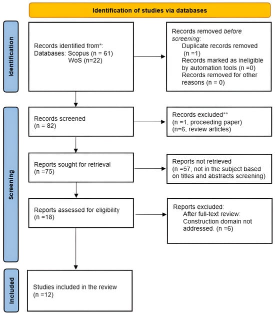Data extraction was conducted following a structured and transparent protocol to ensure the reliability of the synthesized evidence on 3 November 2025. After the initial search yielded 236 records from Scopus and 84 from WoS, the application of database filters reduced these to 61 and 22 records, respectively. Following deduplication, 82 unique studies proceeded to title and abstract screening, during which 7 papers were excluded due to publication type (1 conference proceeding and 6 review articles), and 57 were removed for lacking relevance to the research scope, leaving 18 studies for full-text assessment. A further six articles were excluded during full-text screening due to not meeting the eligibility criteria, resulting in a final set of 12 studies included in the review.
