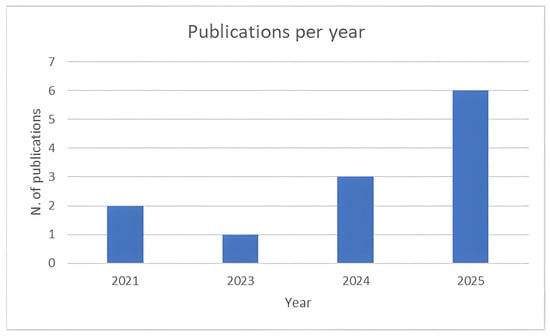 Although we have set 2015 to 2025 as a search window, the twelve included papers were published from 2021 onwards. As shown in Figure 3, the annual distribution of research articles shows that academic interest in the synergy between AM and LC remained modest in the early years of the dataset. In 2021, only two research articles addressed this topic, followed by a pause in publication activity in 2022 and a single contribution in 2023. This pattern reflects an initial phase characterized by exploratory work rather than sustained or coordinated academic efforts. A slight increase is observed in 2024, with three articles published, suggesting a renewed—though still limited—engagement with AM–LC integration. A notable increase appears in 2025, with six publications, suggesting a recent rise in scholarly attention, which may be related to broader interest in digital fabrication, automation, and waste-reduction strategies within construction research [58]. However, given the short timeframe and limited dataset, it is premature to infer sustained research consolidation or a mature research domain.