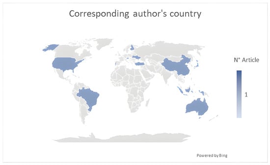 The geographical distribution of the corresponding authors shows that each contributing country is represented by a single article, reflecting a research field that is both highly dispersed and globally present. We can notice that no country appears more than once in the dataset, suggesting that academic interest in AM within the context of LC is emerging simultaneously in many regions, rather than being concentrated in a few dominant areas.