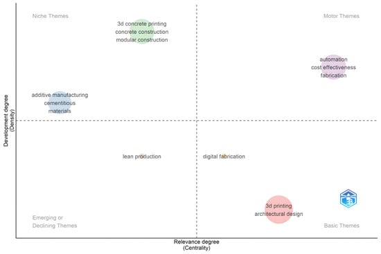 - Basic Themes (High Centrality, Low Density): Themes such as 3D printing and architectural design have high relevance and low development and thus are foundational concepts of the field. These themes are widely used and conceptually central; however, their lower density signals the need for further conceptual refinement and theoretical consolidation.