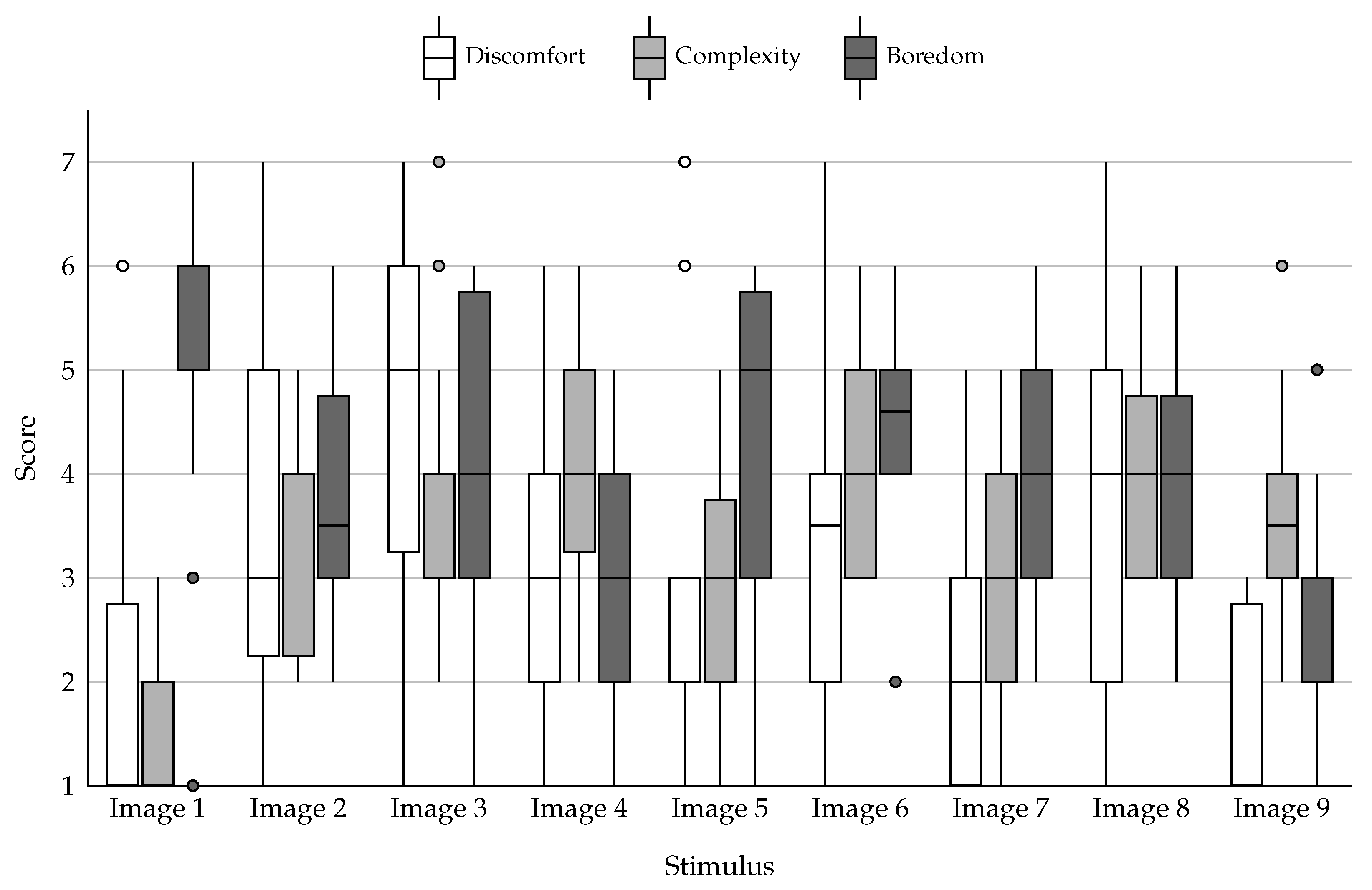 - Discomfort: Responding to the statement “I feel discomfort when looking at this building” on a scale ranging from 1 (No Discomfort: “I feel no discomfort at all”) to 7 (Extreme Discomfort: “I feel a significant and overwhelming level of discomfort”).