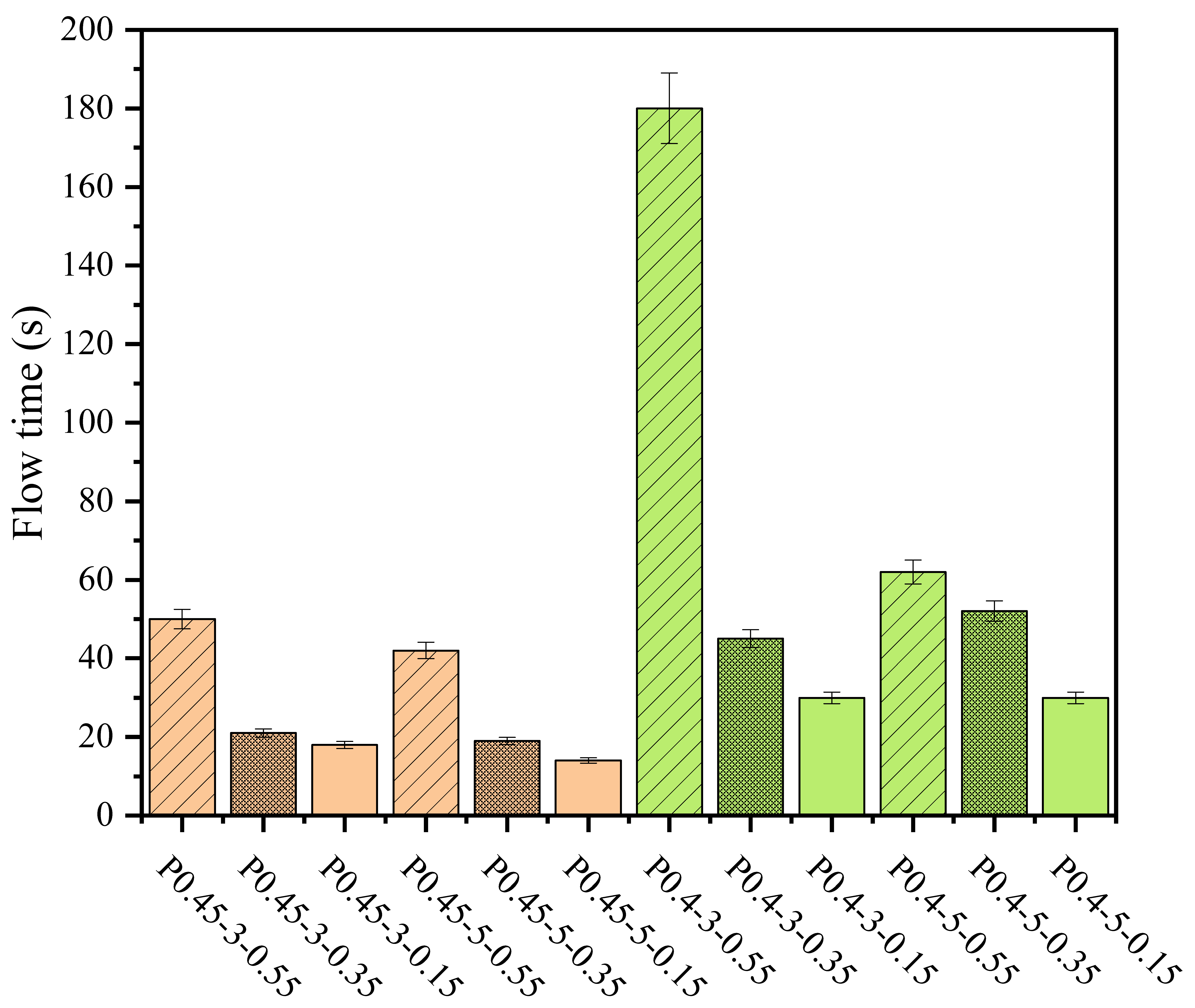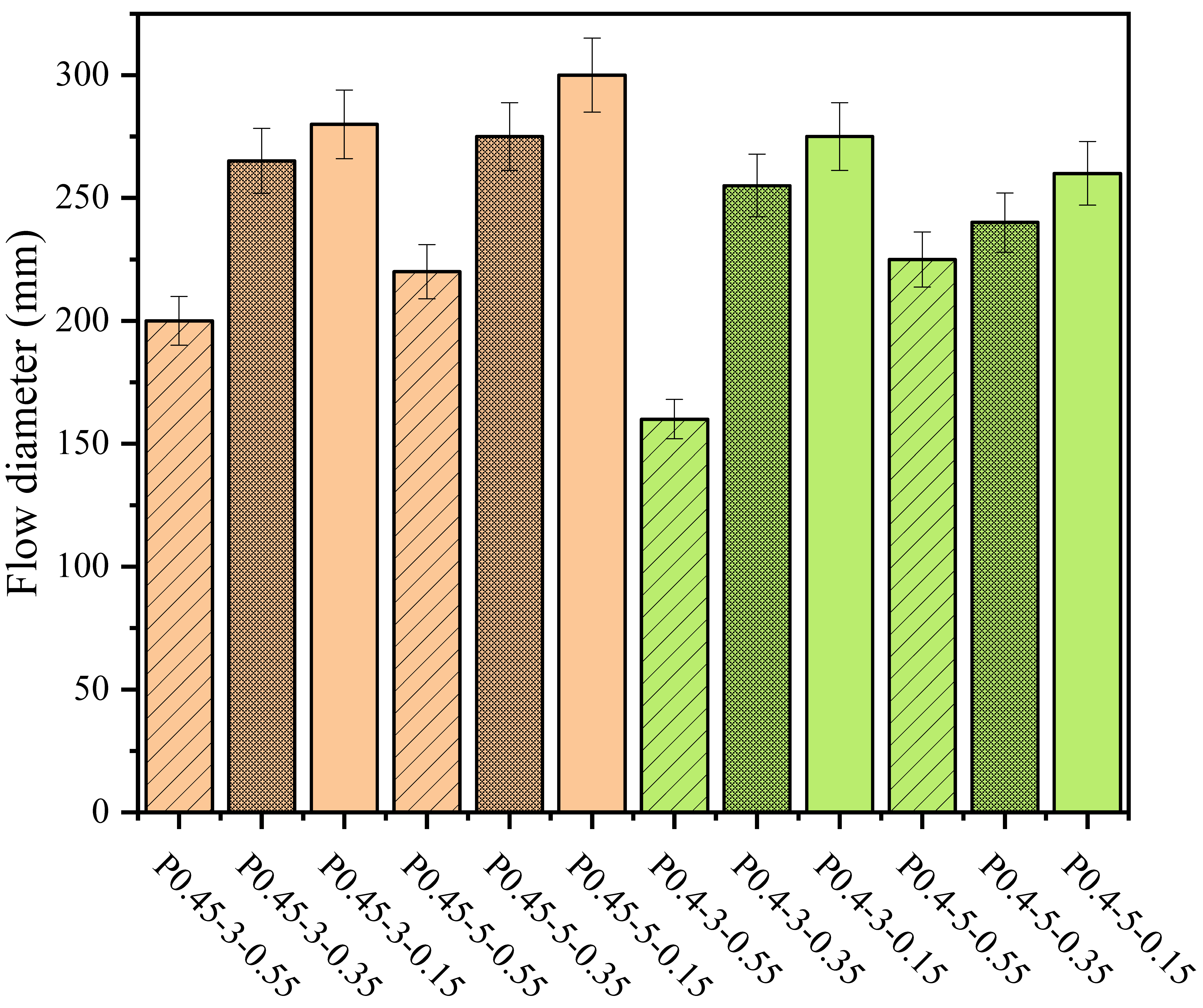 - Increasing W/C and WRA dosage could effectively improve the flow performance of FC. Compared with P0.4-3-0.55, increasing W/C by 0.05 (P0.45-3-0.55) reduced flow time by 72.22% and increased flow diameter by 25%. Increasing water reducing agent dosage by 0.2 (P0.4-3-0.35) reduced flow time by 65.56% and increased flow diameter by 40.63%.