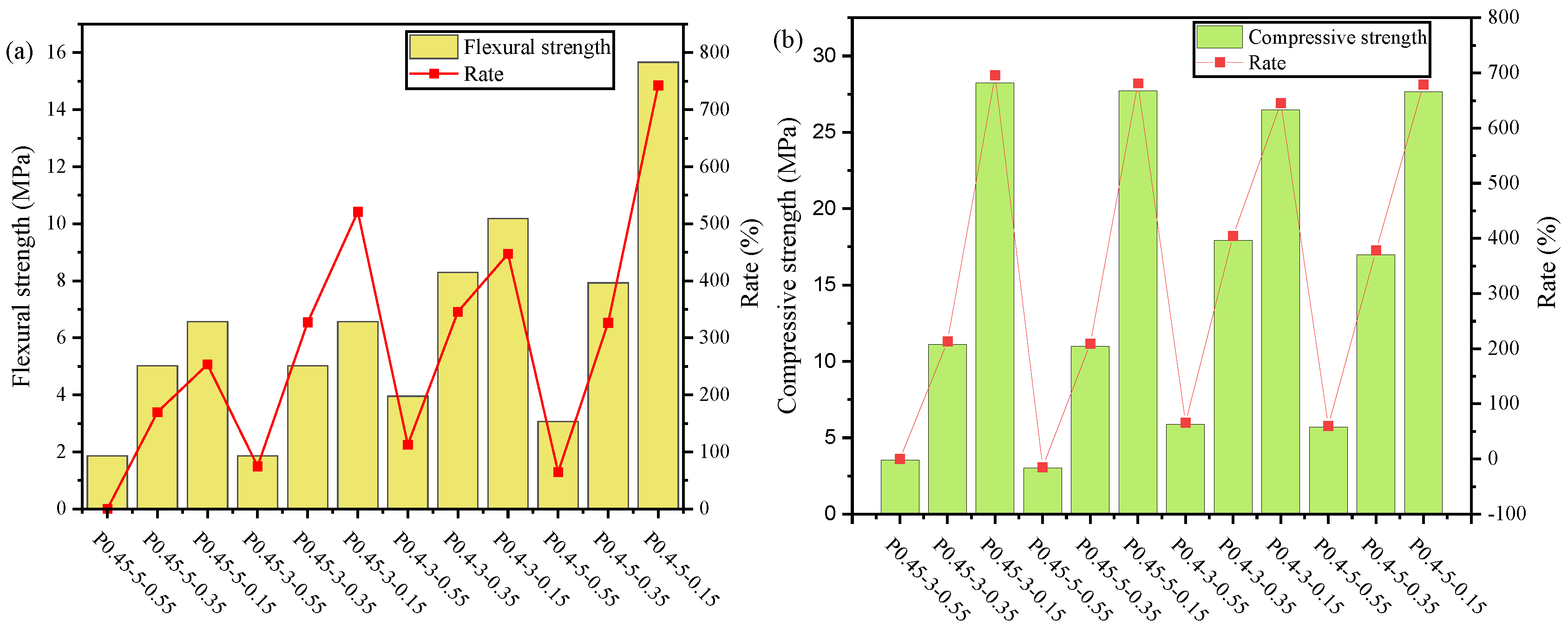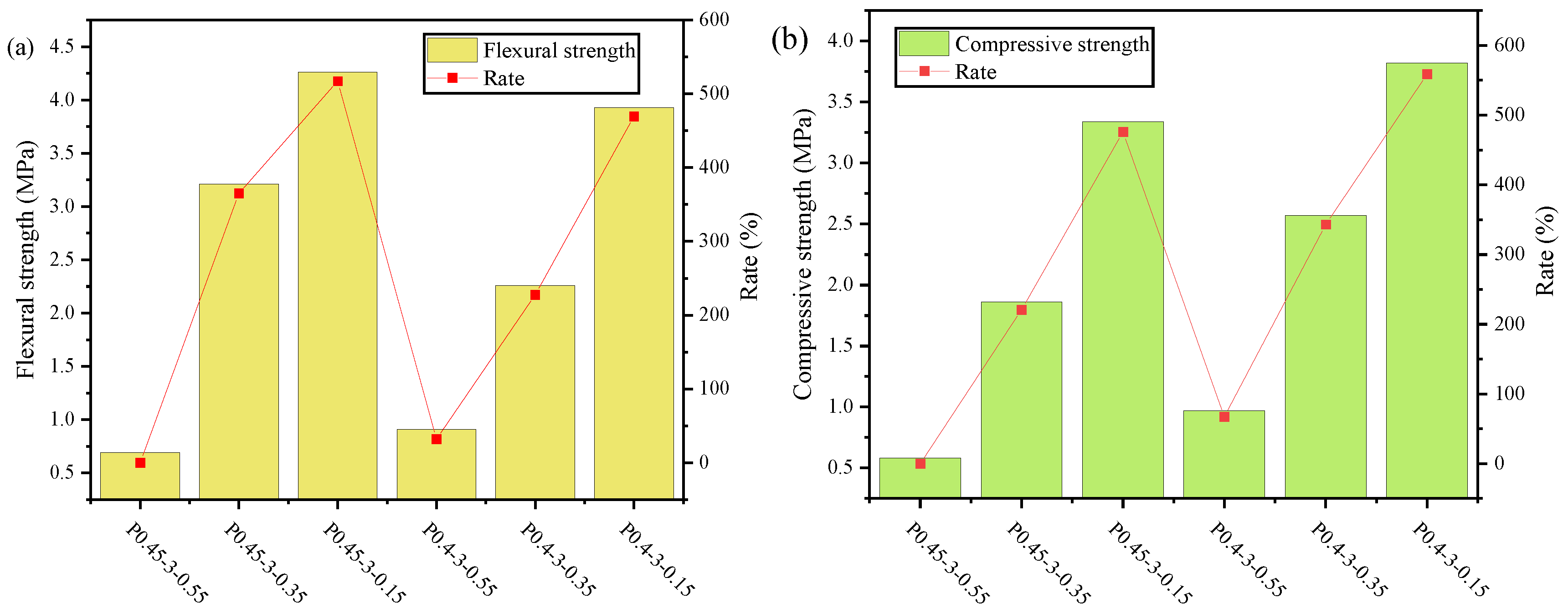 - Increasing W/C and the dosage of WRA reduced the mechanical performance of FC. For P0.4-3-0.55 and P0.45-3-0.55, when the W/C increased by 0.05, the 28d flexural and compressive strength reduced by 17.7% and 36.9%, respectively. Compared with P0.45-5-0.55, increasing the water-reducing agent dosage by 0.2 caused the 28d flexural strength and compressive strength to reduce by 74.7% and 15.4%, respectively.
