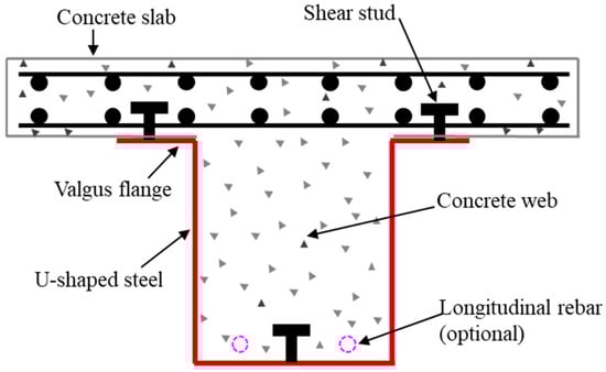 U-shaped steel−concrete composite beams (USCCBs) are novel structural components developed based on traditional steel−concrete composite beams. They consist of an externally U-shaped steel casing and a concrete or reinforced concrete (RC) beam enclosed within it, typically cast in situ together with the upper concrete slab. The two components are connected by shear connectors to form a composite beam with a T-shaped cross-section, as shown in Figure 1. On the one hand, the U-shaped steel casing serves as permanent formwork, thereby reducing formwork requirements during construction. Moreover, as the U-shaped steel participates in load bearing, the demand for reinforcing steel can be reduced. On the other hand, the concrete infill restrains inward buckling of the thin-walled U-shaped steel web, while the confinement provided by the U-shaped steel casing enhances the mechanical performance of the concrete. Previous studies showed that USCCBs exhibit numerous advantages, including high load-bearing capacity, high stiffness, excellent ductility, and good fire resistance, and they are regarded as one of the most recent advancements in steel−concrete composite beams [1]. Furthermore, USCCBs enable greater spans while mitigating issues such as excessive relative slip at the interface between concrete and steel plates, as well as insufficient lateral stability. Consequently, USCCBs have attracted extensive attention from researchers since their introduction.