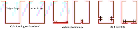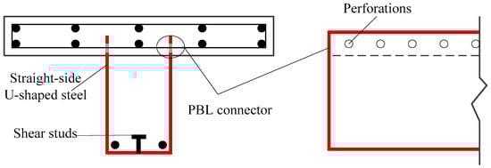 In recent years, some researchers [23,36] proposed a similar treatment method using Perfobond rib connectors (Figure 6). Compared with varus or valgus flanges, straight-side U-shaped steel eliminates the need for a large number of welded shear studs or additional shear connectors. Making uniform perforations at the top of the U-shaped steel web to pass through the transverse reinforcement in the concrete slab enables composite action between the flange and the web. This approach overcomes the susceptibility of thin-walled steel plates to burn-through during welding and the practical difficulty of achieving 90° bending of the top flanges. Moreover, with approximately the same steel usage, it offers higher load-bearing capacity and initial stiffness.
