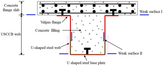 For USCCBs, there are usually two potential weak surfaces, namely, the interface between the concrete flange slab and the web of the composite beam (referred to as flange−web interface) and the interface between the U-shaped steel (web and base plate) and the infilled concrete (referred to as steel−concrete interface) (Figure 3). Only when sufficient shear connection strength is ensured at both interfaces can the USCCBs function effectively as an integrated system and fully exploit its mechanical performance. For this purpose, researchers proposed various forms of shear connectors and conducted a series of related studies.