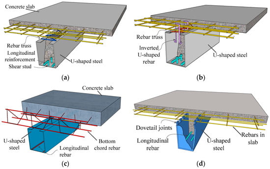 In response to the shortcomings of traditional shear connectors and to facilitate the wide application of USCCBs, some novel shear connectors have emerged in recent years. Liu et al. [70] welded rebar trusses to the top flanges of the U-shaped steel as shear connectors (Figure 5a), while simultaneously welding shear studs to the U-shaped steel base plate. Moreover, an appropriate amount of longitudinal reinforcement was also provided, which significantly reduced the relative slip at the steel−concrete interface. Liu et al. [50,71] further introduced inverted U-shaped reinforcement to enhance the integrity of the flange−web interface (Figure 5b). They concluded that under this configuration, shear studs welded to the U-shaped steel base plate had a negligible influence on the flexural performance and thus could be omitted. Xu et al. [72] proposed to weld the bottom chord reinforcement of the widely used steel truss composite deck to the top flanges of the U-shaped steel as new shear connectors (Figure 5c). The results showed that specimens using only steel trusses as shear connectors cannot achieve full shear connection and additional appropriate shear studs can be incorporated to enhance the connection at the flange−web interface. Furthermore, Yang et al. [38,73] proposed a web-embedded USCCB (Figure 5d) to achieve full shear connection. The specific construction involves cutting evenly spaced dovetail-shaped grooves at the top of the U-shaped steel web. Then, these grooves were embedded into the concrete slab, forming a web-embedded shear connector with the transverse reinforcement at the bottom of the concrete slab.