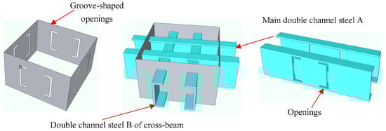 The column limbs of special-shaped CFST columns are flush with the adjacent walls, which effectively eliminates protruding interior columns, increases usable indoor space, and meets the requirements of modern architectural design. In recent years, some researchers investigated the seismic performance of joints between USCCBs and special-shaped CFST columns. Xu et al. [96] applied through-type joints to T-shaped CFST columns and USCCBs. This type of joint was discussed in Section 4.2 (see Figure 7). The main technical procedure is summarized as follows. First, groove-shaped openings are cut at the corresponding positions on the three rectangular steel tubes, and the main double-channel steel A and round holes are drilled to allow the passage of reinforcing bars. The three rectangular steel tubes are then welded together to form a T-shaped composite steel tube column. Afterwards, the main double-channel steel A and double-channel steel B (of cross-beam) are inserted through the corresponding groove-shaped openings and welded to create a through-type joint. Finally, using the main double-channel steel A as the connecting piece, the U-shaped steel beam with an arc-cut end (to increase the length of the butt welds) is installed from bottom to top and connected to the main double-channel A by butt welding, with the connection end matching the arc-cut end. To ensure the effective transfer of internal forces, it is recommended that the thickness of the connecting double-channel steel be 1 to 2 mm greater than that of the U-shaped steel beam. Their research revealed that joint failure was characterized by the bulging of the steel tube at the joint, tearing of the connecting double-channel steel, and crushing of the concrete slab. These beam−column joints exhibited good ductility and energy-absorption capacity. Providing longitudinal reinforcement at the beam bottom passing through the panel zone or increasing the axial load ratio was found to enhance the bearing capacity and shear stiffness of the joint.