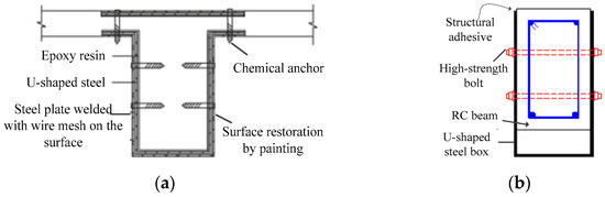 RC beams strengthened with U-shaped steel casing. (a) Exterior-wrapping U-shaped steel plate [105]; (b) strengthened with U-shaped steel box.